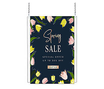 Hanging sign holders take standard poster frames and combine them with hanging hardware kits with chain or nylon line. How about displaying a vinyl or fabric banner? Our large line of poster rails attach to the top and bottom of your graphic. Gravity helps keep the material taut between the two rails. Able to display large format graphics, these simple tools are very cost-effective when compared to regular frames. These hanging styles are usually installed overhead, but there are other applications worth considering. Take cable display systems. These sleek and modern designs are tailor-made for real estate offices that like to showcase listings behind their storefront windows. Our hanging poster frames and rails can also be installed behind windows, an often forgotten space ripe for marketing and advertising.