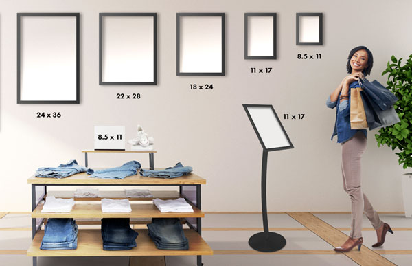 Browse countertop sign holders, wall mount poster frames, or freestanding sign stands conveniently pre-sorted by size.
